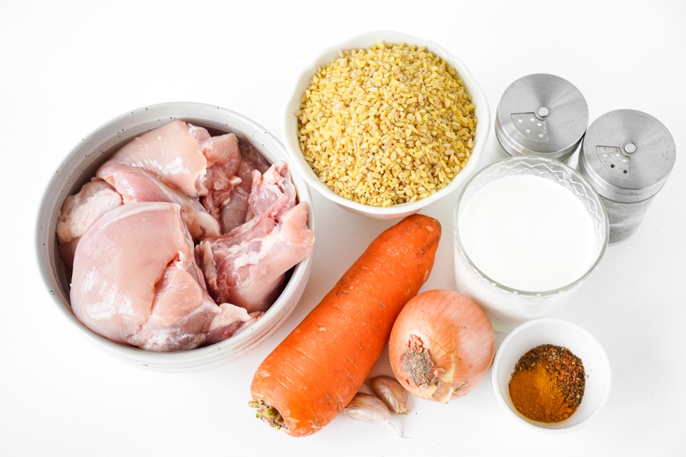 Подготовить ингредиенты для приготовления булгура с курицей и овощами на сковороде. Достать куриное филе из холодильника заранее. Использовать филе бедра, оно более сочное и не пересыхает при тушении. Если выбирать филе грудки, учесть, что его легко пересушить, поэтому готовить чуть аккуратнее. Сливки выбирать 10-20% жирности.
