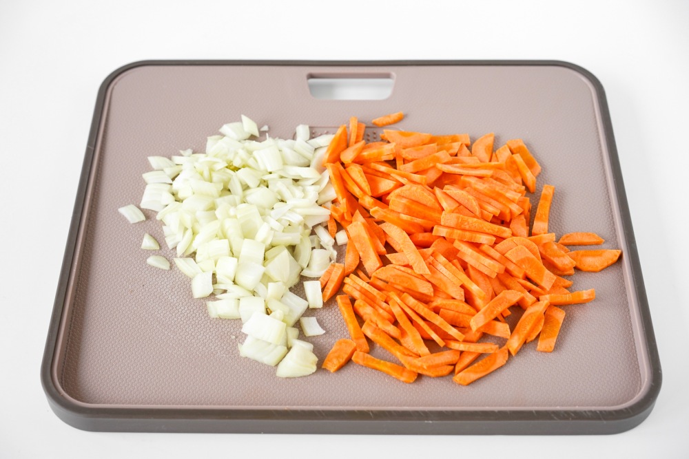 Снять шелуху с луковицы, промыть и нарезать небольшими кубиками, чтобы они быстрее размягчились на сковороде. Морковь очистить овощечисткой, отрезать кончики и нарезать аккуратными брусочками, так она сохранит форму и не превратится в кашу при тушении.