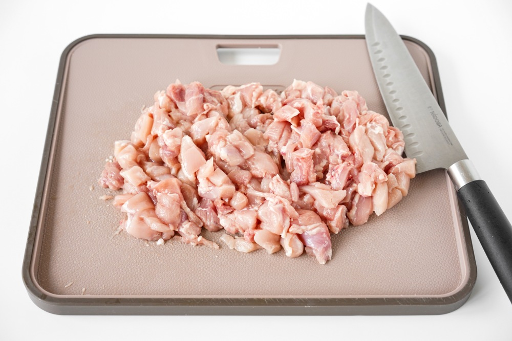 Промыть филе бедра под прохладной водой, тщательно обсушить бумажными полотенцами, чтобы при обжарке не было лишней влаги. Нарезать мясо кусочками примерно 2–3 см, так оно хорошо прожарится и останется сочным внутри.