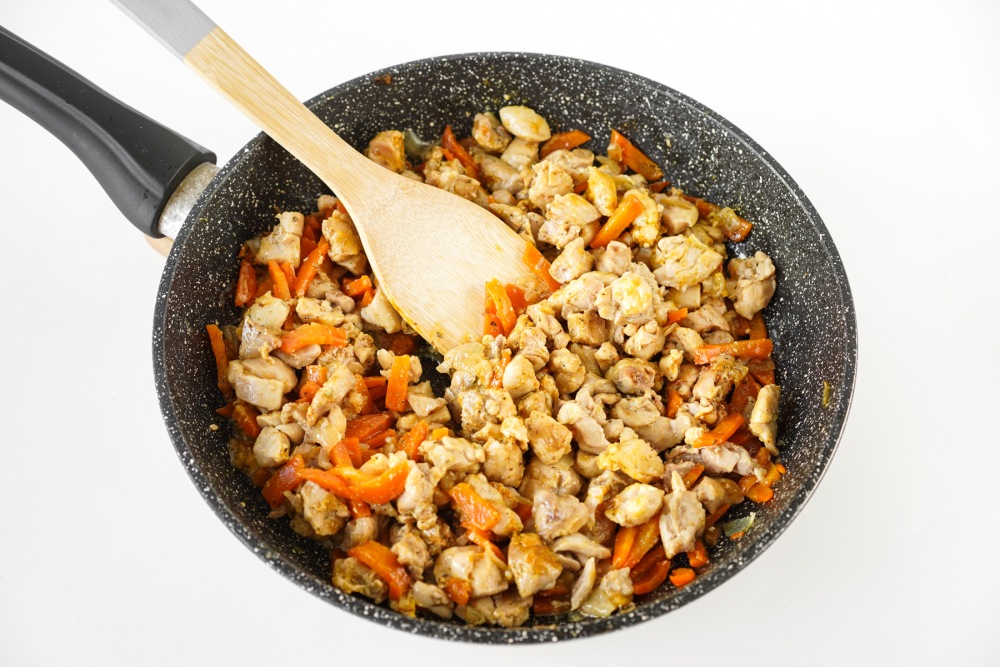 Выложить кусочки курицы в сковороду к овощам. Перемешать, чтобы мясо лежало одним слоем. Готовить 7–9 минут на среднем огне, пока кусочки не схватятся и слегка подрумянятся. За 2 минуты до окончания жарки добавить измельчённый чеснок, соль, перец и специи. Перемешать и дать постоять на огне, чтобы чеснок раскрыл аромат, но не сгорел.