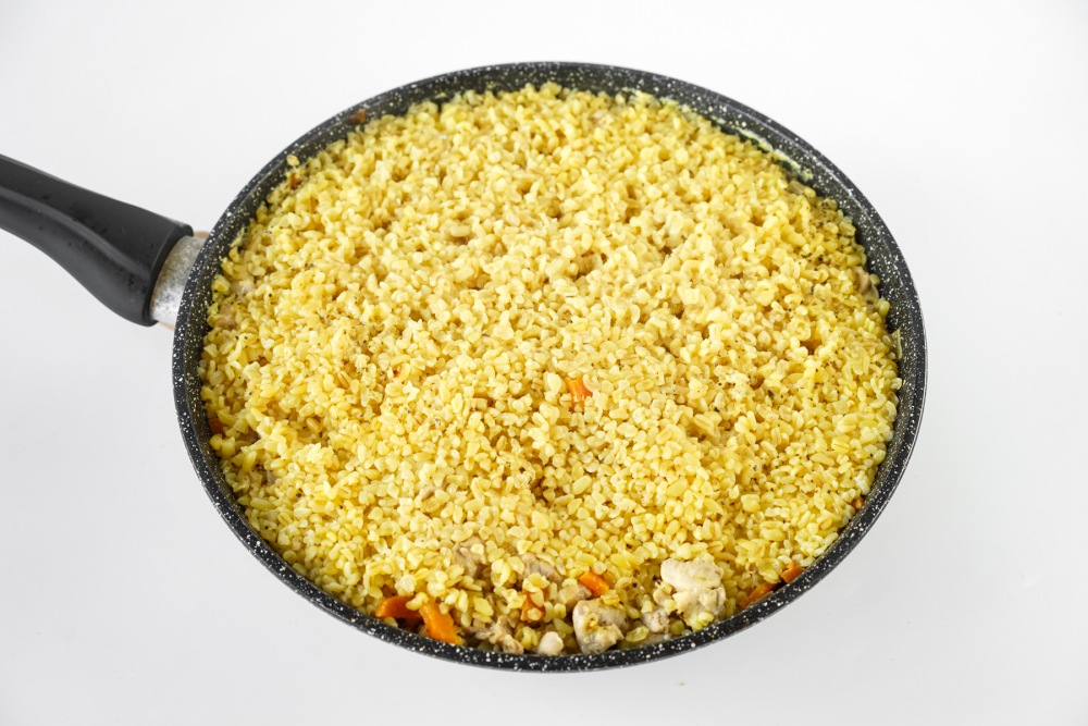 Булгур с курицей и овощами на сковороде