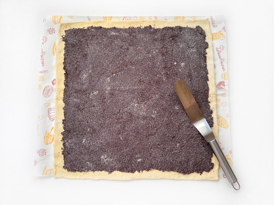 Равномерно распределить маковую начинку, оставляя свободный край 1-1,5 см. Удобно это делать кондитерской лопаткой.