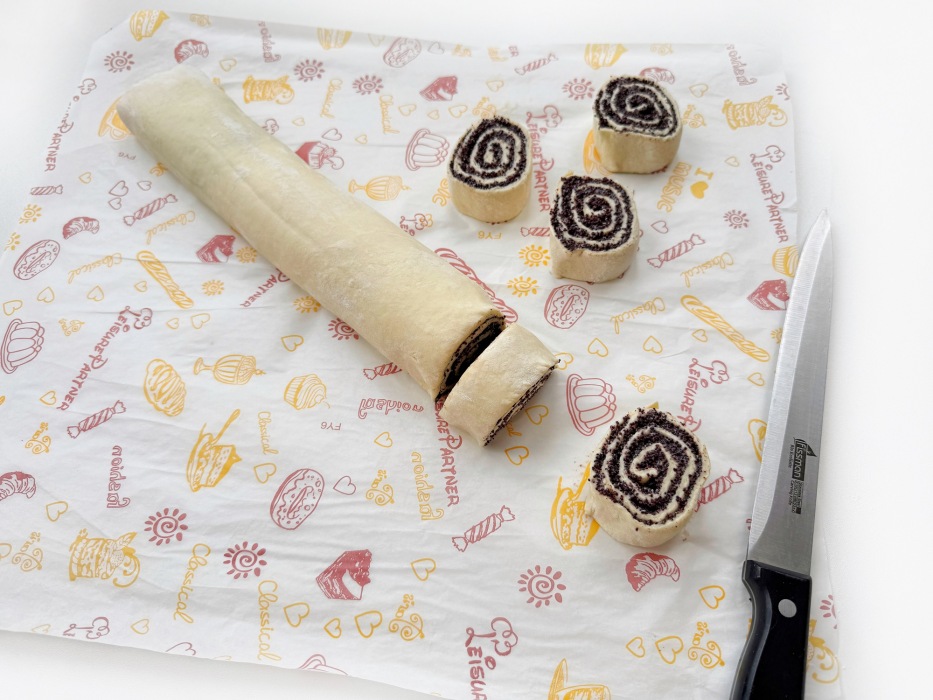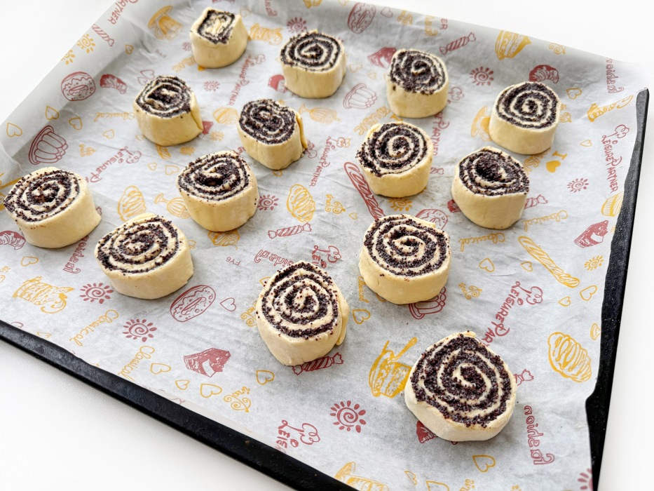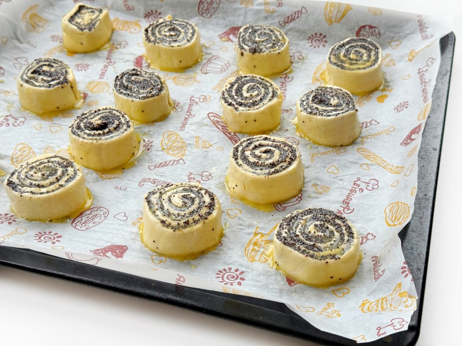 Выложить булочки срезом вверх на противень, застеленный пергаментом.