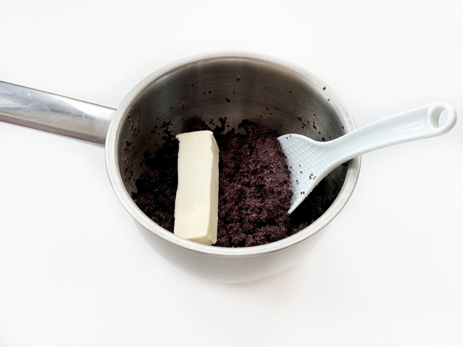 Добавить холодное сливочное масло. Тщательно перемешать массу до однородности. Масса должна стать густой и пластичной.