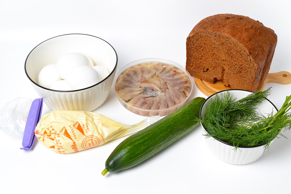 Подготовить ингредиенты: цельнозерновой или ржаной хлеб, сельдь в масле, свежие огурцы, яйца, майонез и зелень.