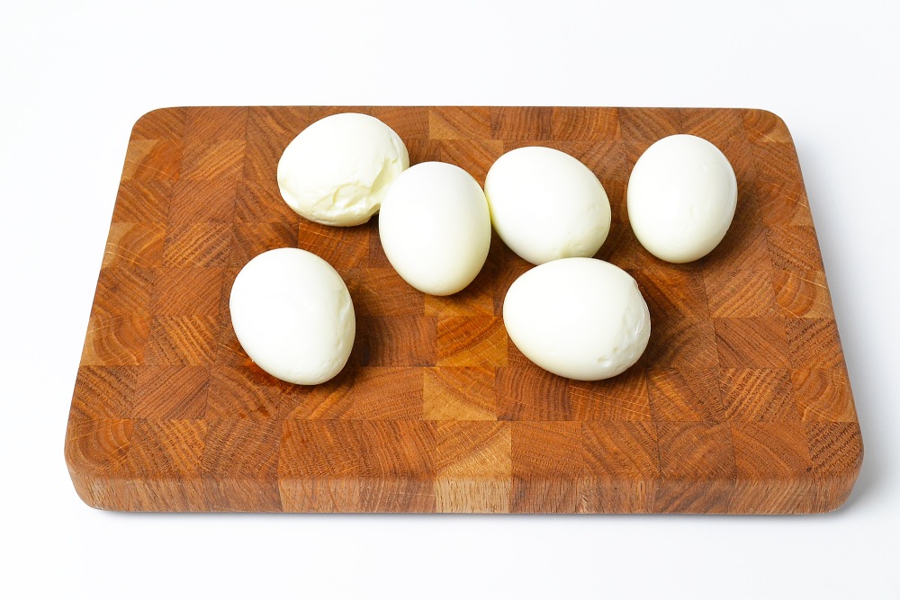 Яйца отварить вкрутую, залить холодной водой и полностью остудить. Затем очистить.