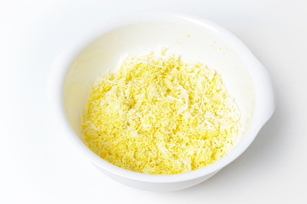 Натереть яйца на мелкой или средней терке вместе с желтком сразу же в миску, в которой будет готовиться намазка.