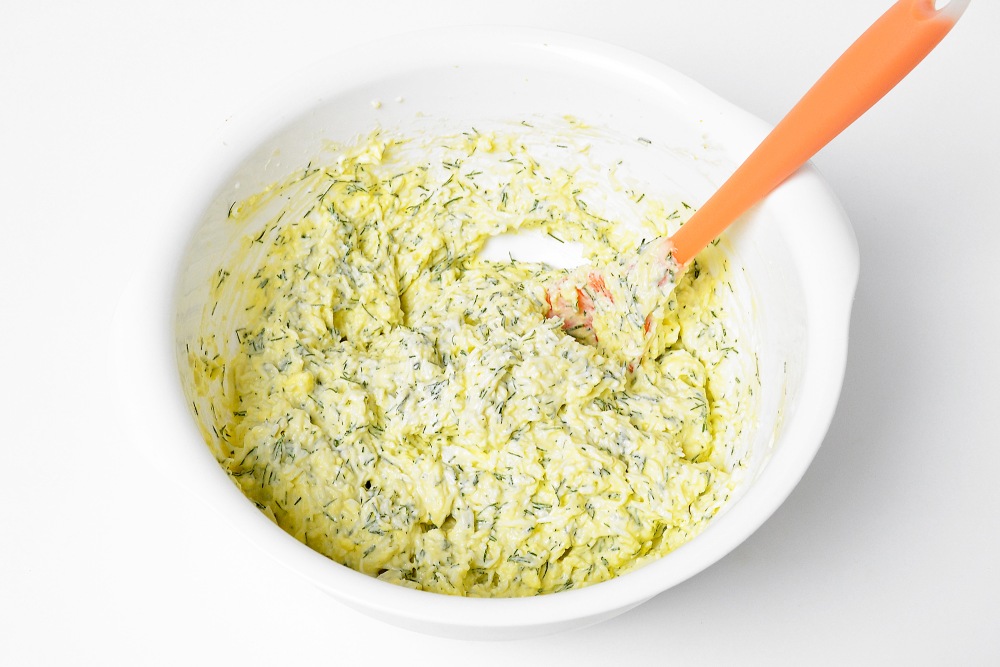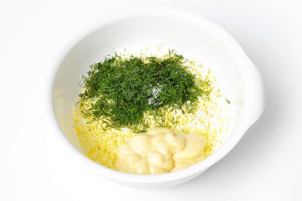 Добавить к яйцам мелко нарезанный укроп и подготовленный майонез.