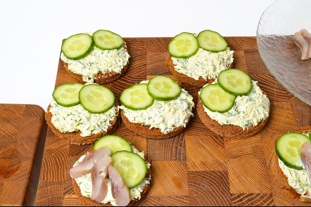 Рядом с огурцами, выложить по 2-3 кусочка сельди, слегка вдавливая ее в яичную смесь. Только так, чтобы та не сползала с хлеба.
