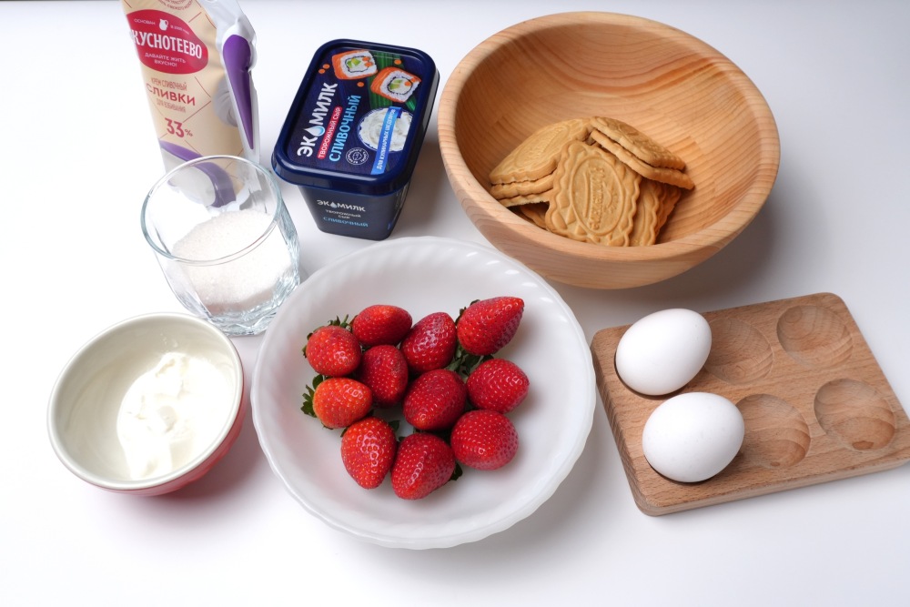Подготовить все ингредиенты для десерта на новогодний стол. Яйца, сметана и сливочный сыр нужны комнатной температуры.