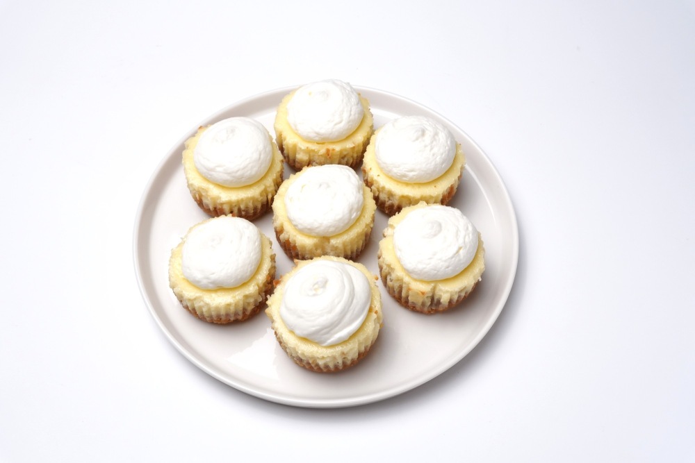 На охлажденные мини-чизкейки выложить шапочки из взбитых сливок.