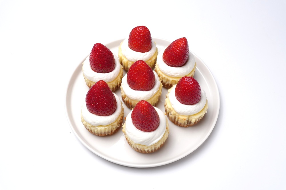 Сами чизкейки делаются достаточно быстро, но потребуется время, чтобы они остыли. Я рекомендую сделать основу за 1-2 дня до мероприятия и прямо перед подачей покрыть чизкейки сливками и украсить клубникой. Чизкейки я выпекала в бумажных формах, чтобы они легко доставались, а перед подачей их сняла.