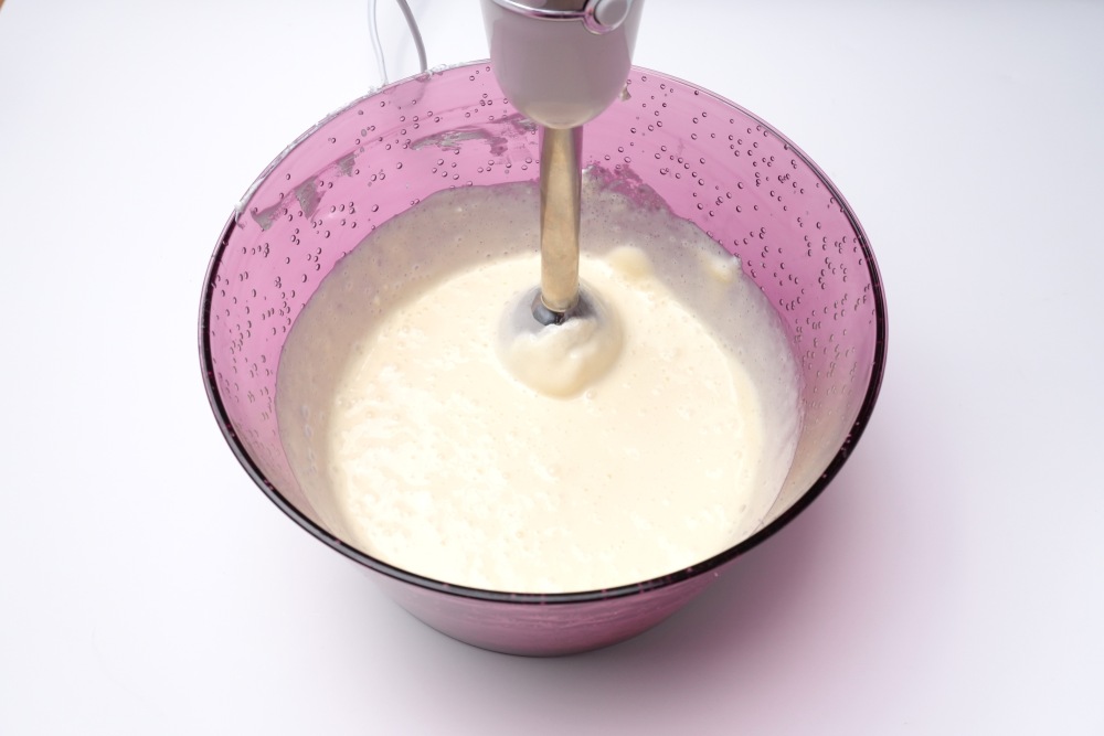 Взбивать нужно сначала на низкой скорости, постепенно увеличивая до максимальной. Как сливки начнут густеть, и будет оставаться след от венчика, аккуратно всыпать частями сахар, продолжая взбивать.