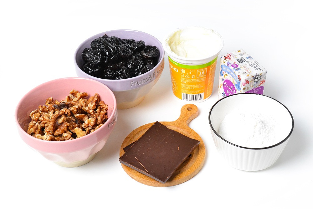 Подготовить ингредиенты: жирную сметану, сливки от 30%, чернослив, грецкие орехи и сахарную пудру. Также потребуется шоколад и кондитерская посыпка (опционально). Шоколад убрать в морозилку.