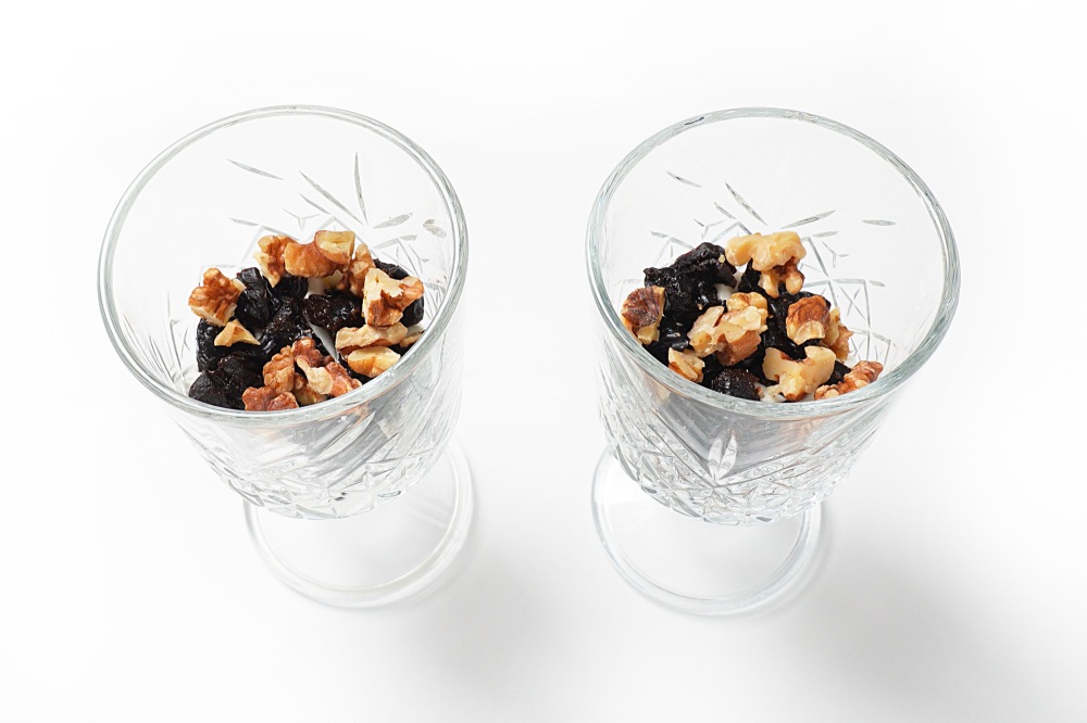 На дно стаканов объемом 300-400 мл выложить слой чернослива, а сверху – орехи. Чернослива следует брать чуть больше, чем орехов, примерно 1 ст. л. с горкой.
