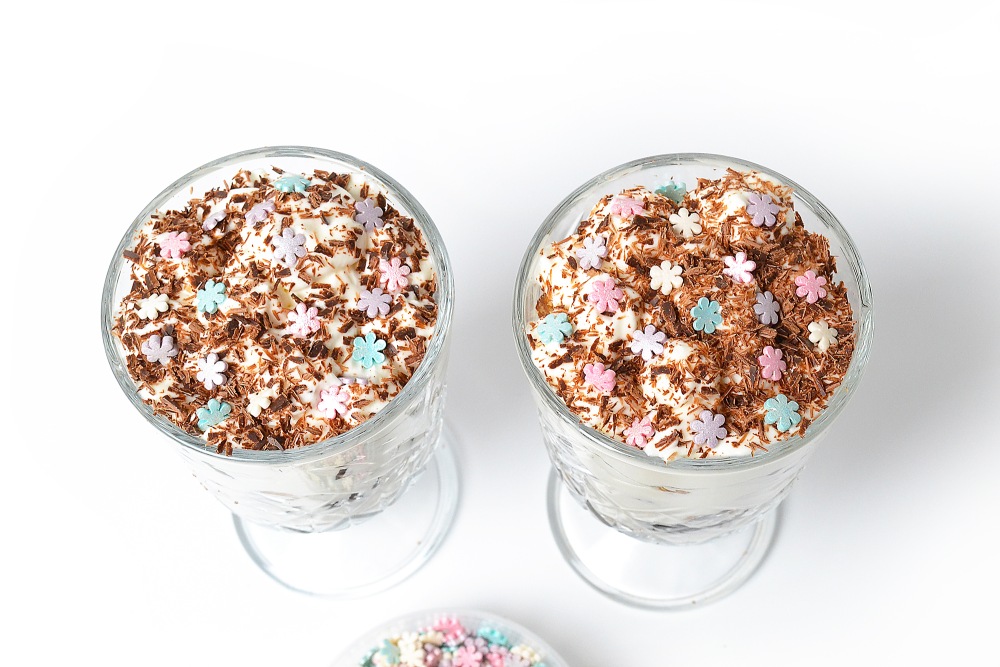 Рецепт очень простой, и даже взбивать сметану и сливку до идеальной плотности не нужно. Ведь в стакане им все равно не нужно держать форму. А украсить можно так, как вам хочется: добавить новогоднюю посыпку, потереть шоколад или просто просеять сверху какао.