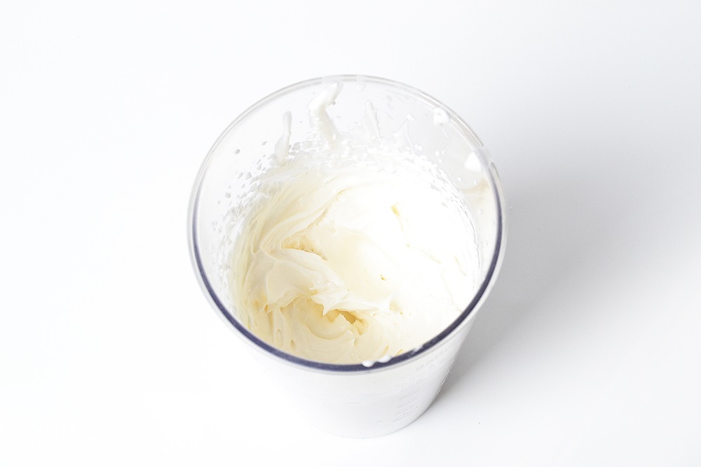 Сметану взбить в течение 3-4 минут, чтобы она стала немного плотнее и воздушнее. Затем добавить сахарную пудру в 2-3 этапа, взбивая после каждого добавления 30-40 секунд на максимальных оборотах миксера.