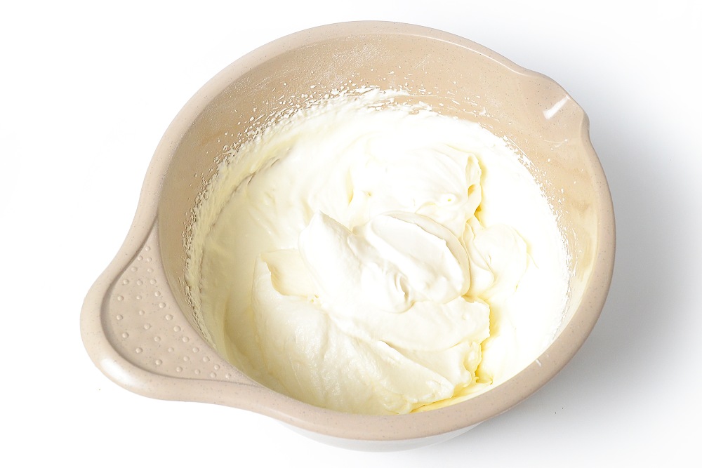 К умеренно плотной сметане добавить взбитые сливки и перемешать миксером на небольших оборотах еще около 1 минуты.