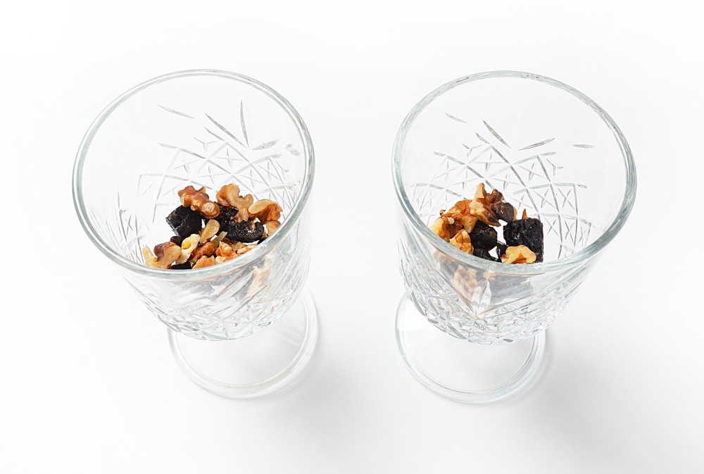 В стаканы положить по ложке чернослива и чуть меньше орехов.