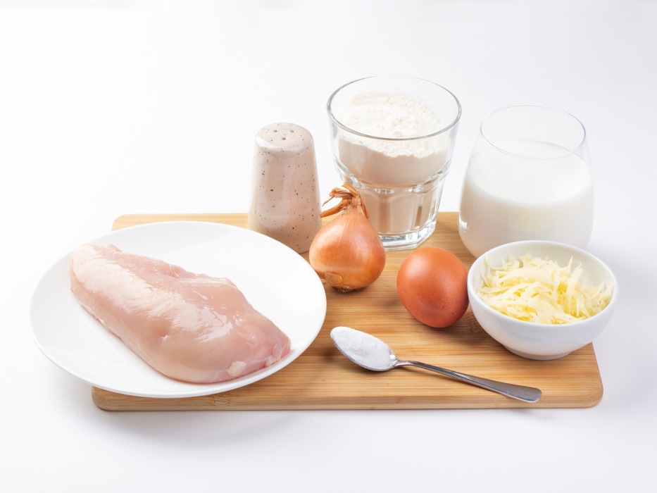 Заранее подготовить все ингредиенты для сытных домашних маффинов с курицей на завтрак. Филе я использую от куриной грудки, это самый лучший вариант. Помойте мясо, промокните его бумажным полотенцем. Обязательное используйте твёрдый сыр. Внимательно читайте состав на упаковке - сыр должен быть натуральный, без пальмового масла и заменителей молочного жира.
