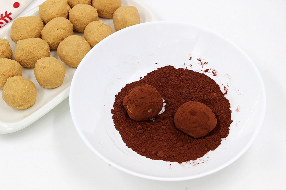 Высыпаю какао в широкую тарелку с высокими краями, закидываю 2-3 шарика, берусь за края и кручу тарелку, а шарики себе обваливаются.