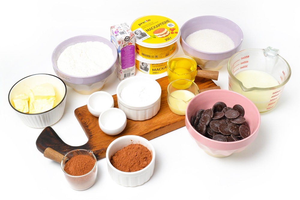 Подготовить ингредиенты: шоколад, муку, сливочное масло, яйца, сахар, какао, сахарную пудру, маскарпоне, жирные сливки, соль, соду, молоко, а также бисквиты или орехи для украшения.