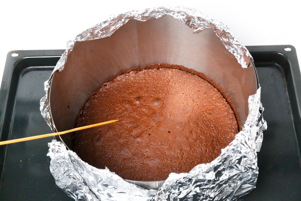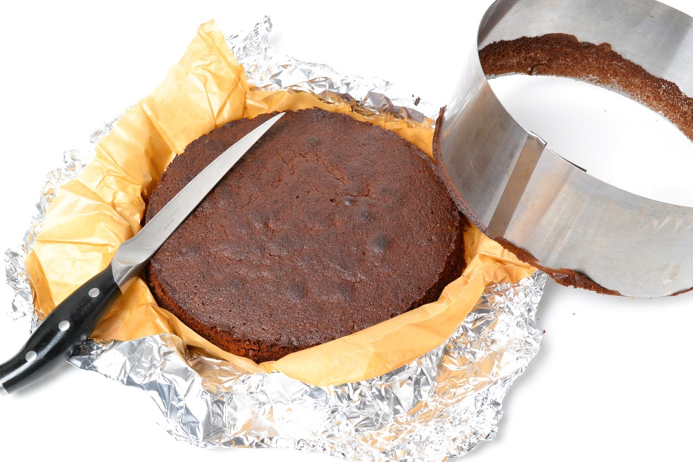 - Лучше всего бисквиты получаются в кулинарных кольцах, а не в обычных разъемных формах. Подготовить кольцо для выпечки очень просто: раздвиньте на нужный диаметры, положите на стол фольгу, а сверху пергамент, поверх установите кольцо и подогните фольгу в центр, цепляя края за верх формы. Снизу прижмите, чтобы тесто не вытекало. Удобнее всего использовать плотную гриль-фольгу от 20 мкм толщиной.