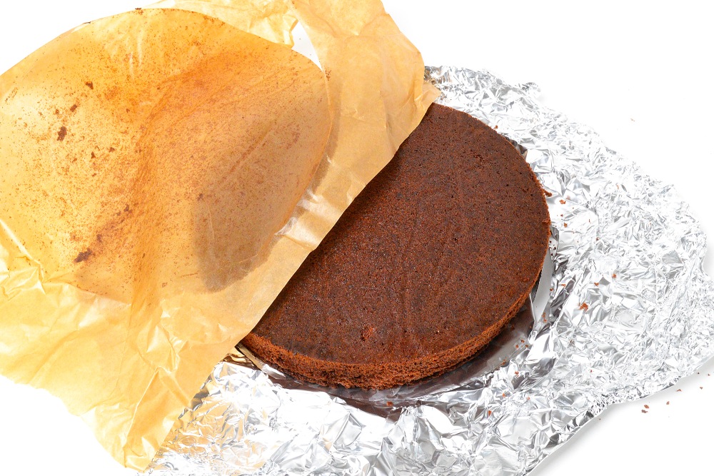 Удалить фольгу и аккуратно снять пергамент, перевернув бисквит.
