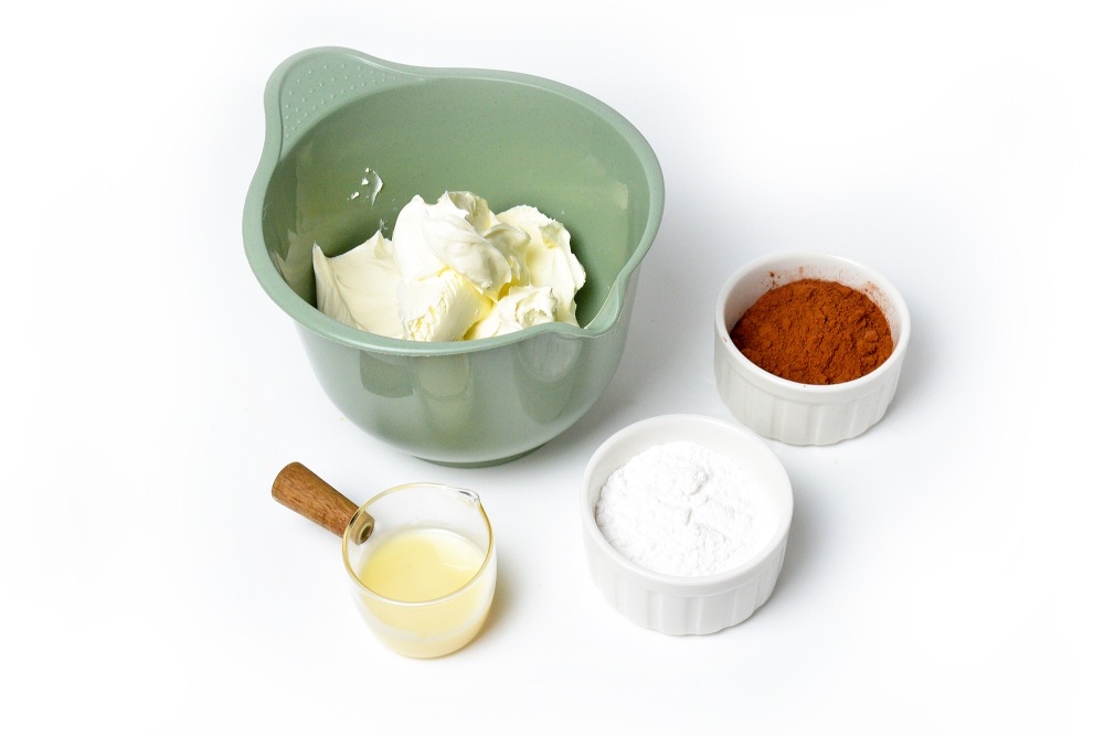 Сливочный сыр смешать с какао, сахарной пудрой и сгущенным молоком.