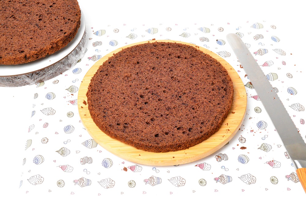 Коржи извлечь из пленки. Каждый разрезать пополам. Я использую длинный бисквитный нож с зубчиками – это самый быстрый и простой способ нарезки бисквита, дающий идеальный результат почти без крошек. Если вы регулярно печете торты, очень рекомендую обзавестись таким помощником.