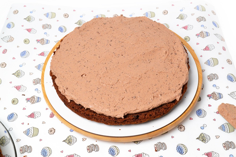 На следующий день покрыть торт тонким слоем оставшегося крема. Если хотите идеально ровный торт, то крема лучше сразу же приготовить больше примерно на 1/3. Тогда им можно хорошо выровнять боковины и верх.