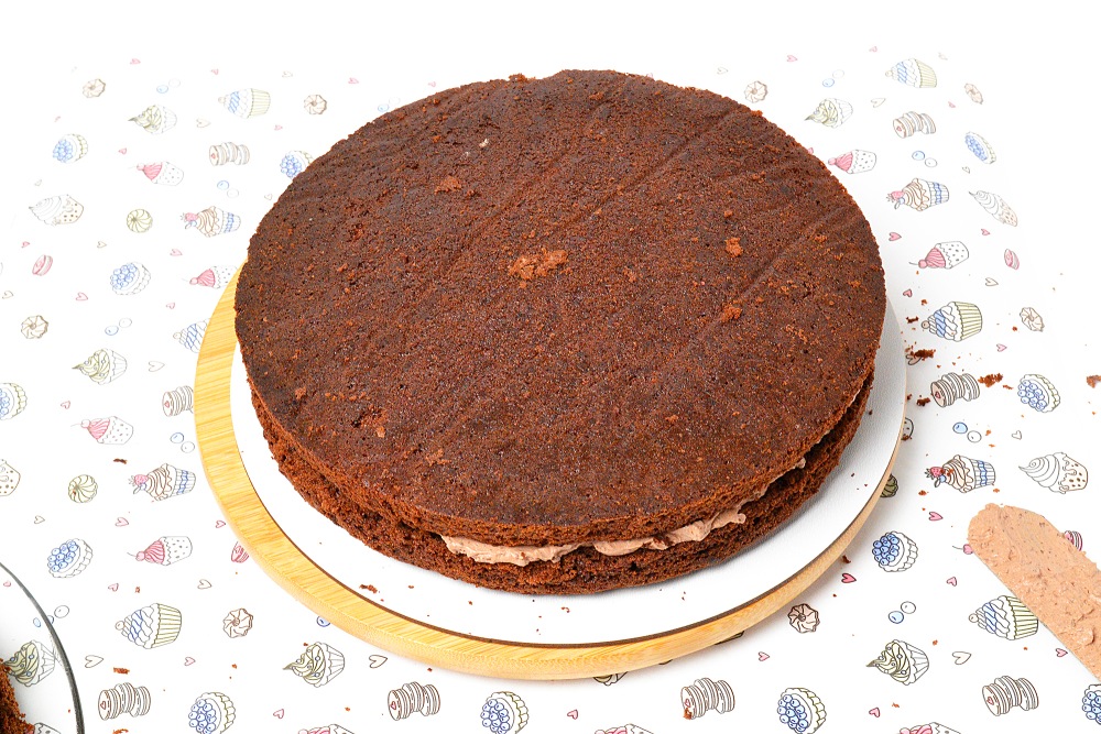 Сверху уложить второй корж нижней частью вверх. Слегка прижать.