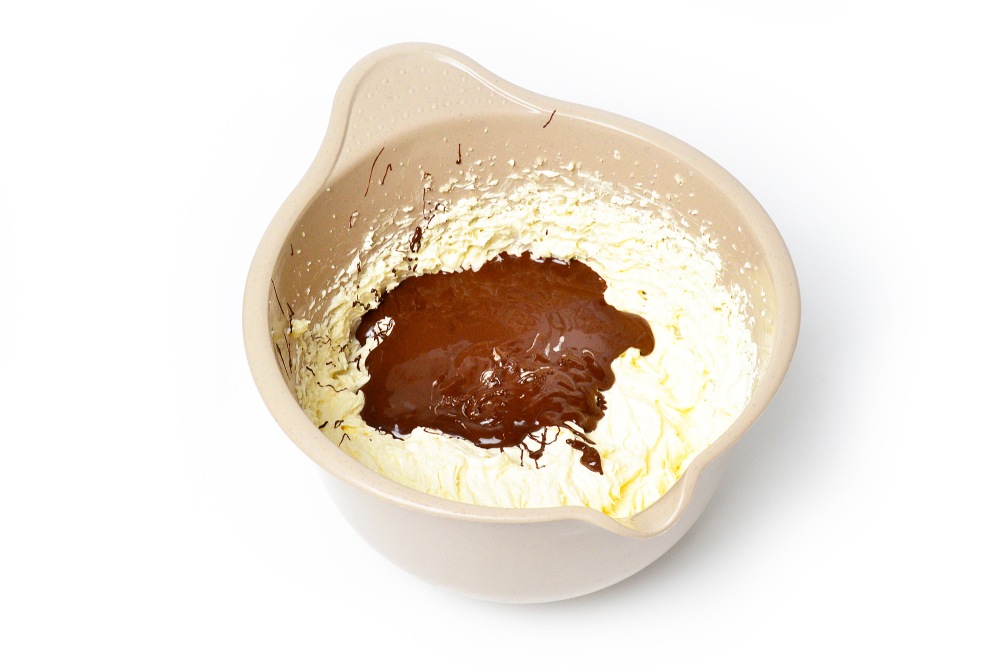Шоколад вылить к сливочному сыру и сразу же взбить миксером на оборотах чуть ниже среднего.