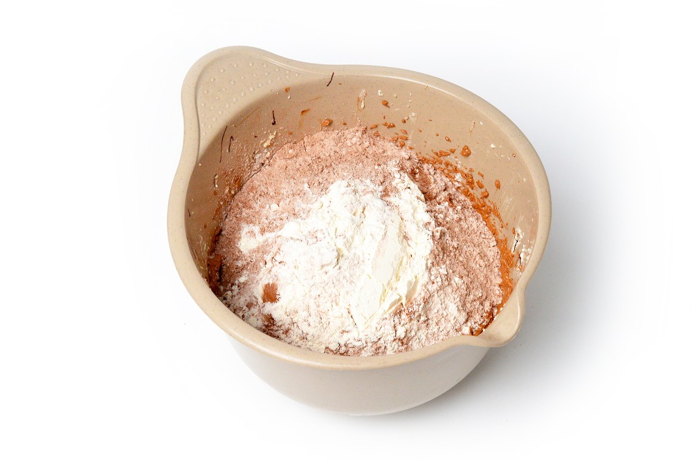 Добавить сухие ингредиенту к масляной смеси и на минимальных оборотах миксер смешать все вместе до объединения.