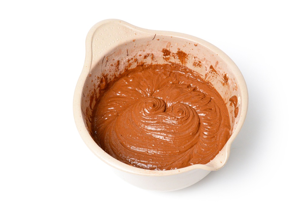 Влить в тесто теплый растопленный шоколад и сразу же тщательно взбить миксером до однородности.