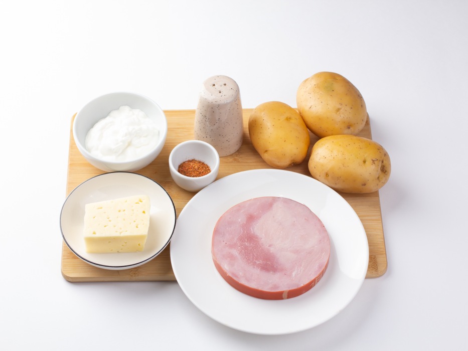 Вам понадобятся только картофель, сыр и ветчина. Эти продукты легко найти в любом магазине, и они часто уже есть под рукой. Блюдо получается сытным и сбалансированным: картофель дает углеводы, ветчина — белок, а сыр — жиры. Это полноценный прием пищи в одной порции.