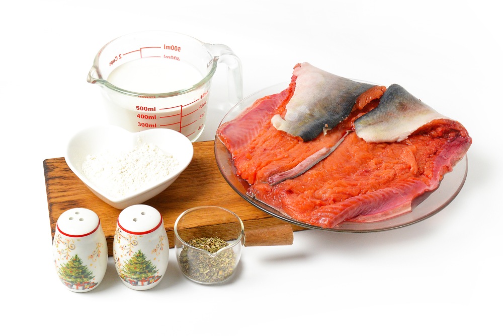 Подготовить ингредиенты для приготовления филе горбуши в сливочном соусе в духовке на Новый год. Если используете замороженную рыбу, достаньте ее из морозилки заранее и разморозьте в холодильнике. Вместо горбуши можно взять любую другую красную рыбу. Белая рыба не всегда хорошо сочетается со сливочным соусом.