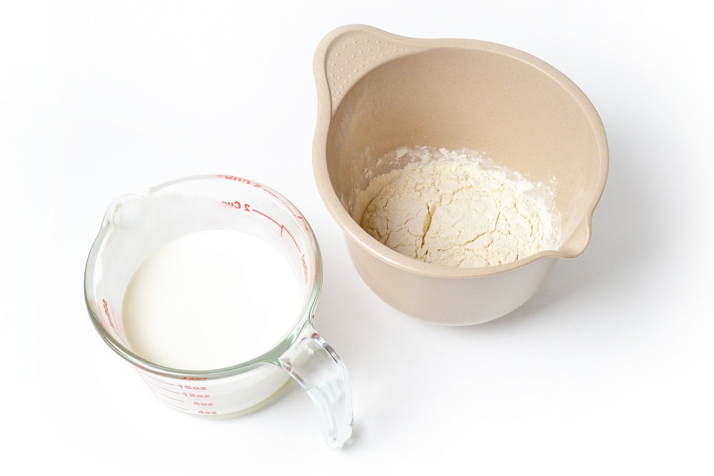 В миске соединить муку и около 100 мл сливок, тщательно перемешать, чтобы не было комочков. Влить остальные сливки.