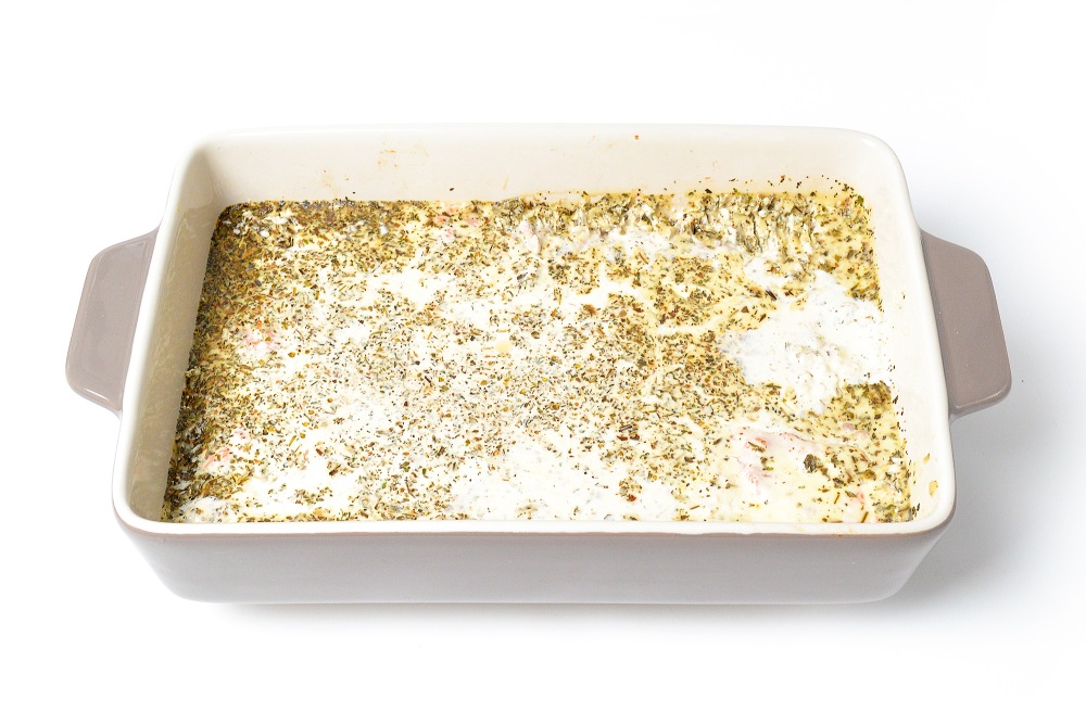 Залить полученной смесью рыбу. Она должна полностью покрыть кусочки. Для формы с внутренним размером 34х20 см 400 мл сливок вполне достаточно.