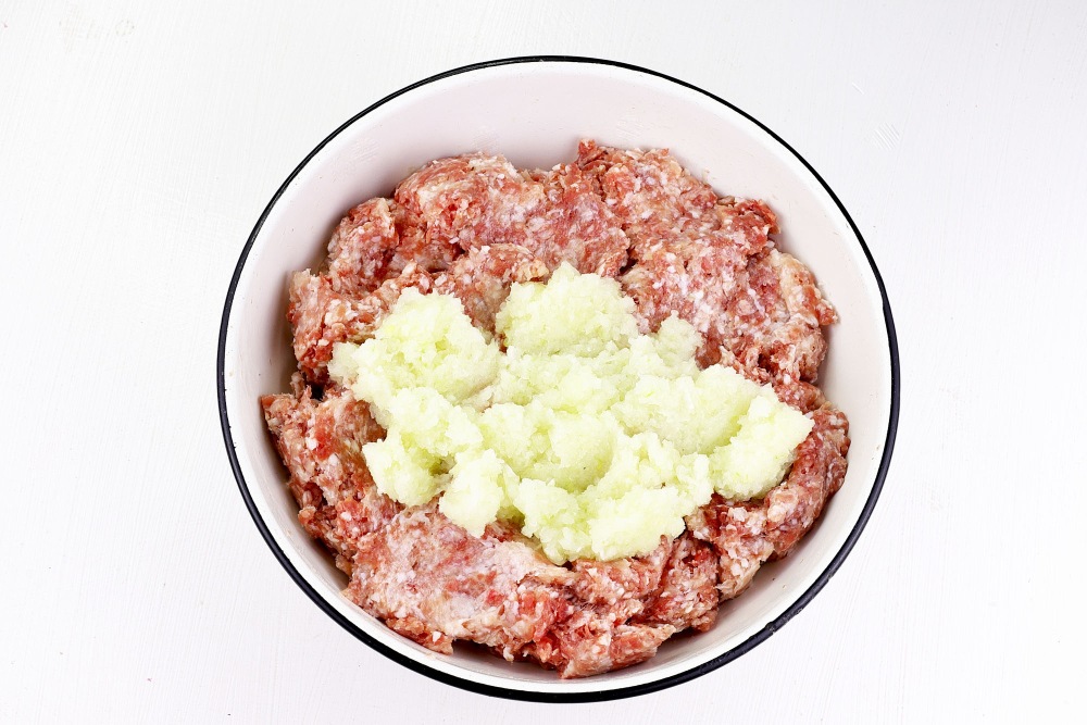 Для вымешивания лучше взять просторную миску с высокими бортиками – в ней должно быть достаточно места, чтобы фарш можно было не только перемешать, но и хорошенько отбить. Выложить в миску мясную основу, а сверху добавить ту самую луковую кашицу.