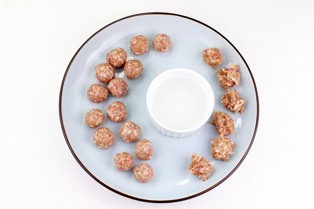 Перед началом работы обязательно смочить ладони водой, чтобы фарш не лип к рукам, а шарики получались идеально гладкими. Я обычно отмеряю примерно по 10 граммов фарша на одну штуку – такие маленькие фрикадельки быстрее готовятся и аккуратно смотрятся и в супе, и в соусе к пасте. Взять немного фарша и слегка покатывать его между ладонями, пока не получится ровный шарик без трещин. Такая «полировка» гарантирует, что фрикаделька сохранит форму и не развалится во время жарки или варки.