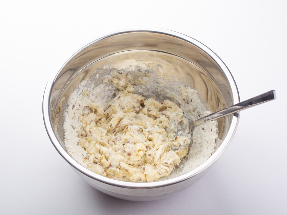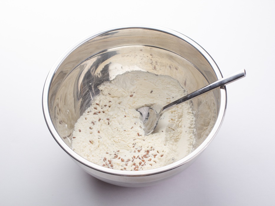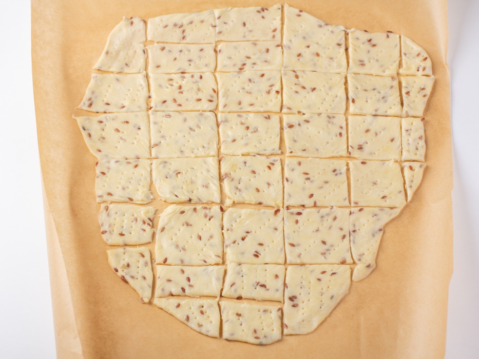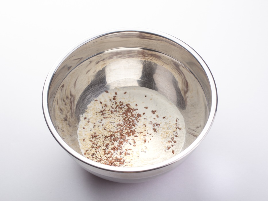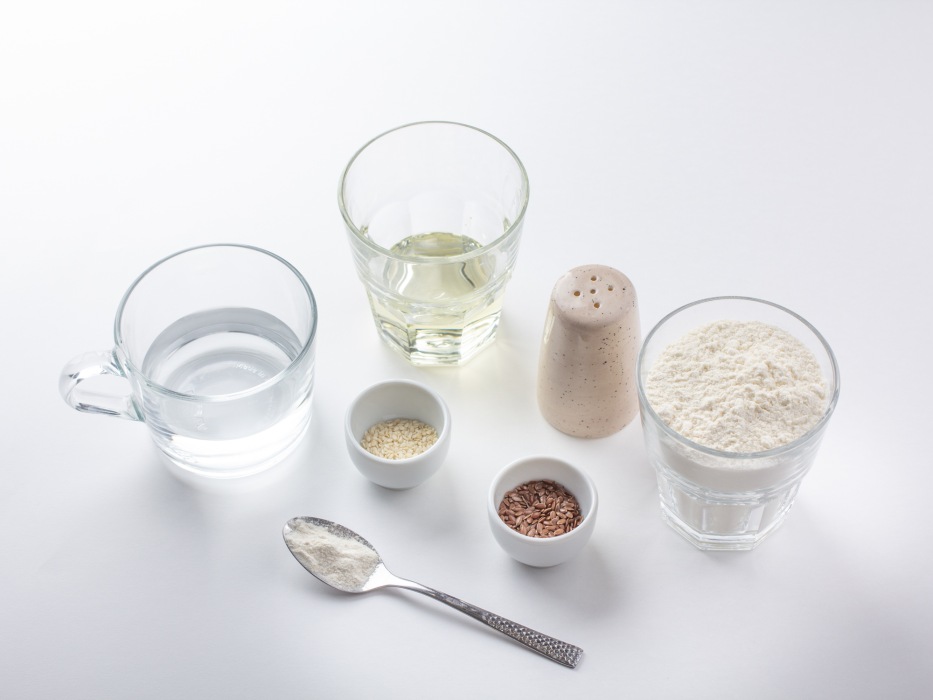 Подготовить все ингредиенты для классического галетного печенья без яиц. Отмерить нужное количество муки, масла, воды, семян льна и кунжута.