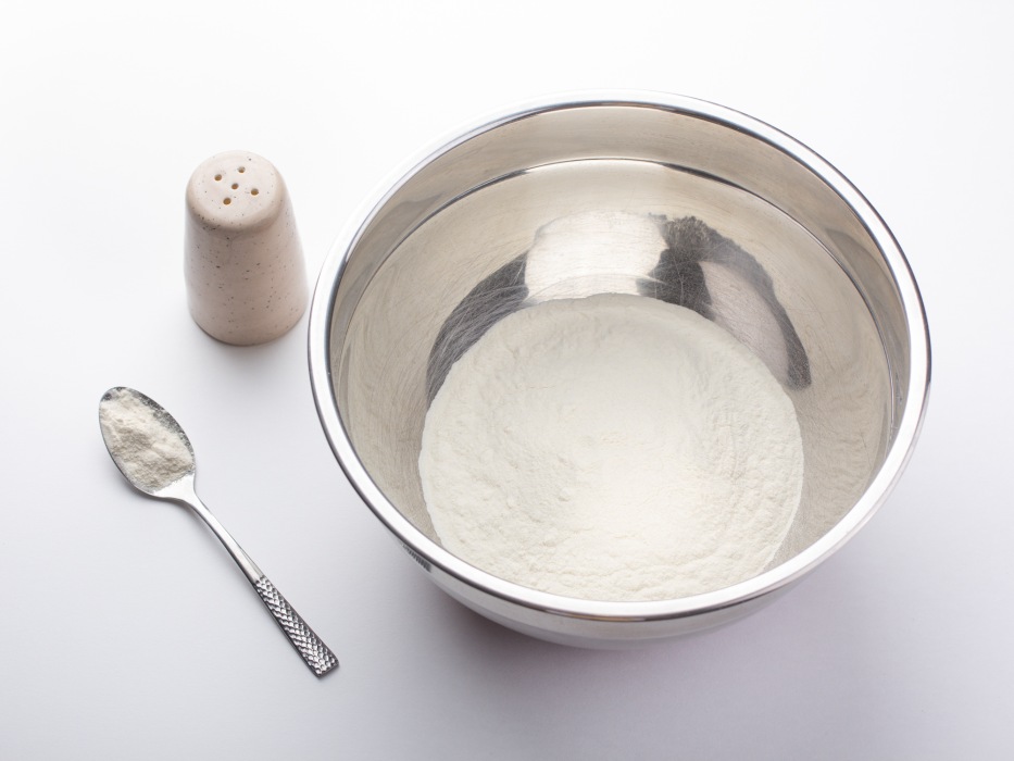 Добавить в муку соль и разрыхлитель.