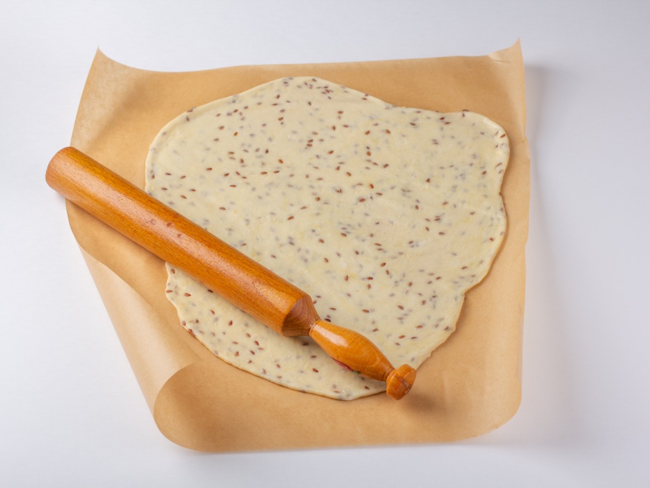 Постелить бумагу для выпечки и раскатать на ней тесто.