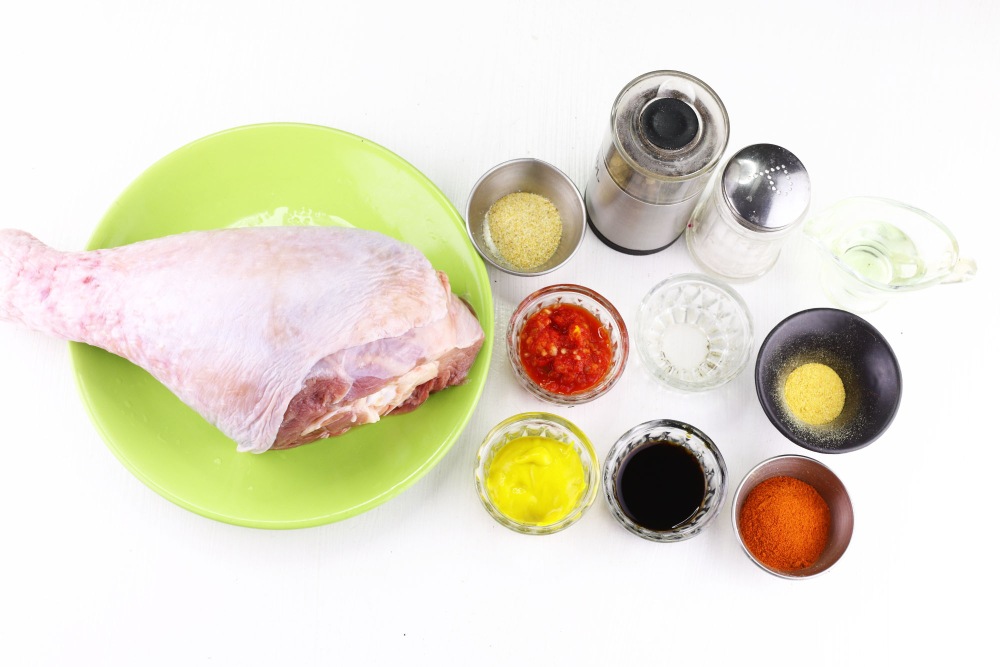 Подготовить необходимые ингредиенты для приготовления сочной голени индейки в духовке.