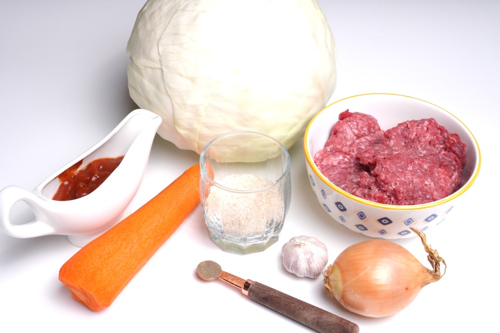 Подготовить все ингредиенты. Фарш должен быть полностью разморожен. Для заморозки голубцов понадобятся плоская доска, пленка или пергамент и пакет. Для отваривания капусты нужна большая кастрюля, в которую целиком сможет поместиться кочан.