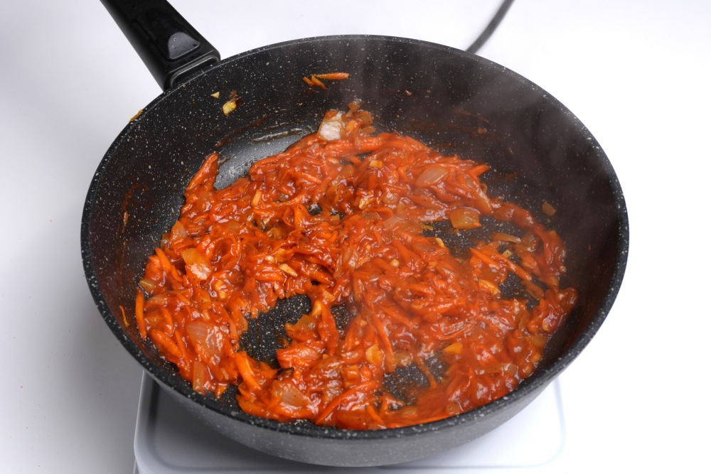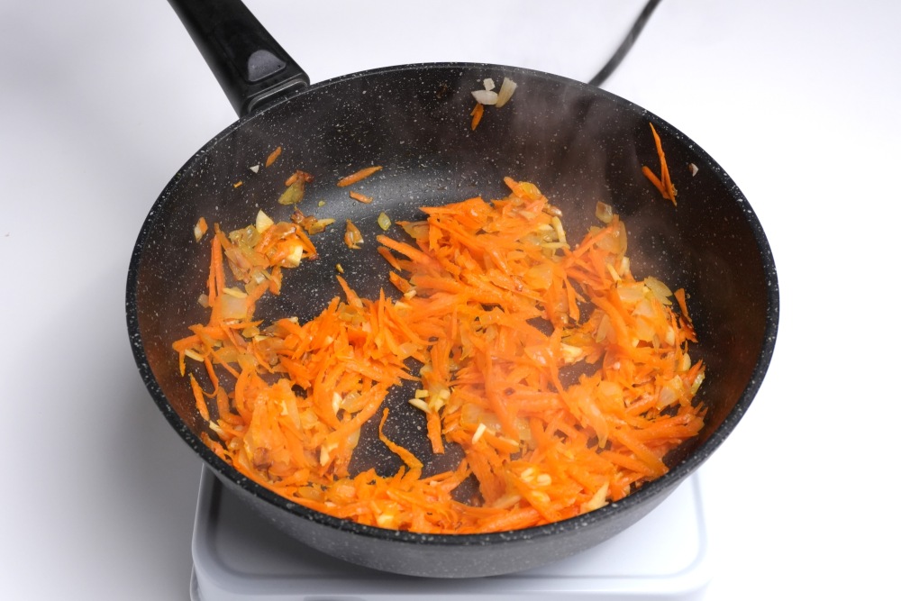 Для зажарки необходимо мелко нарезанный лук и морковь, натертую на терке, обжарить на растительном масле.