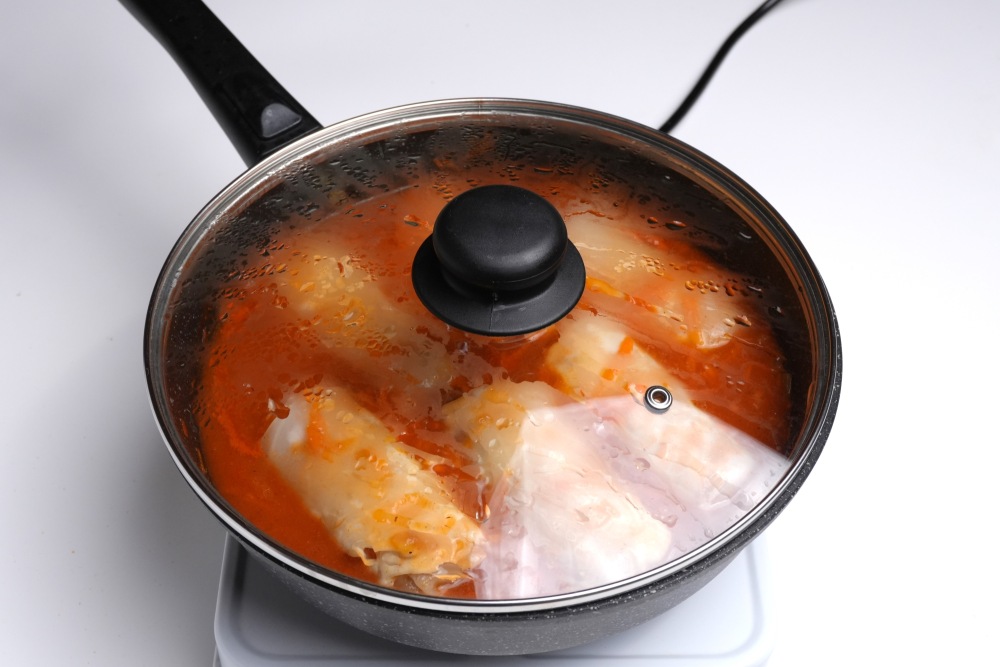 Выложить голубцы в томатный соус швами вниз, накрыть крышкой. Томить голубцы на слабом огне 40-50 минут.