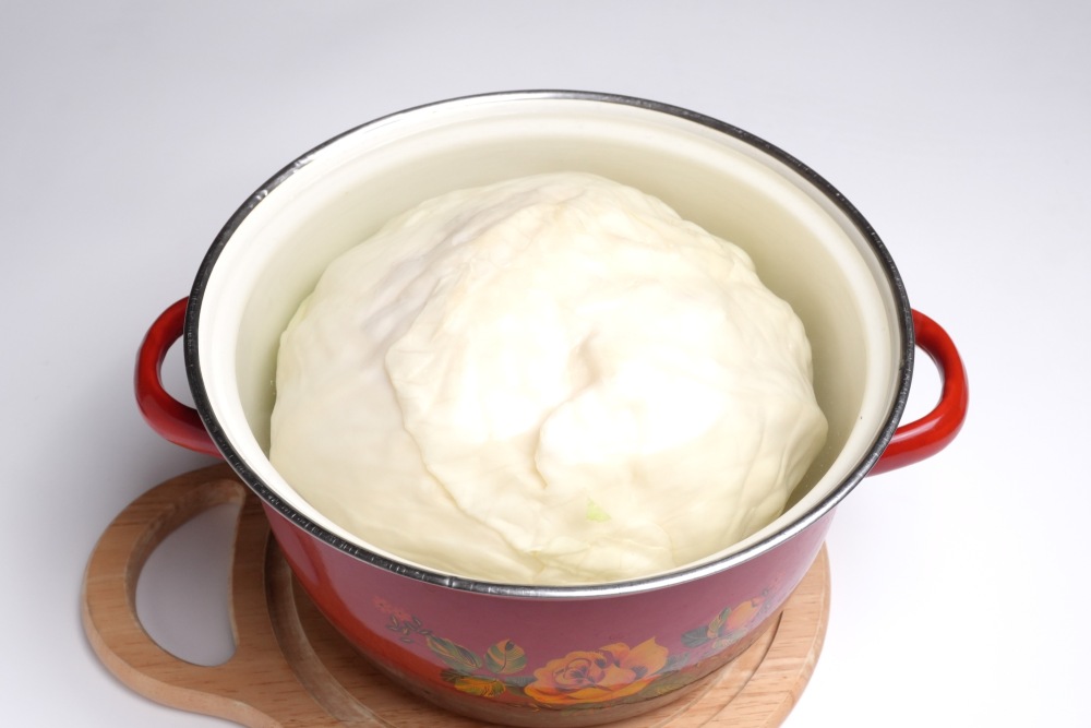 В глубокую кастрюлю поместить кочан кочерыжкой вниз, залить кипятком. Варить под крышкой на слабом огне 5-15 минут после закипания. Листья должны легко гнуться, но не рваться.