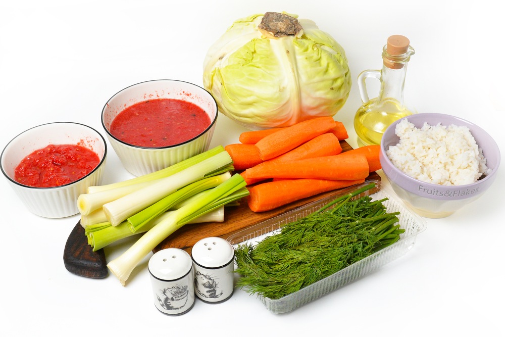 Подготовить ингредиенты: капусту, рис, морковь, томаты и лук, а также специи, укроп и растительное масло для жарки.